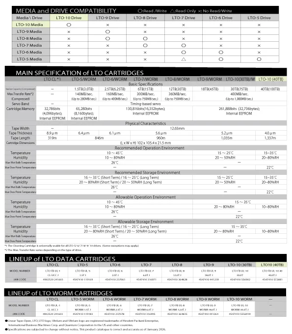 • Construcción física para alta densidad: cinta de 12.65 mm de ancho, 4.0 μm de espesor y 1,337 m de longitud.